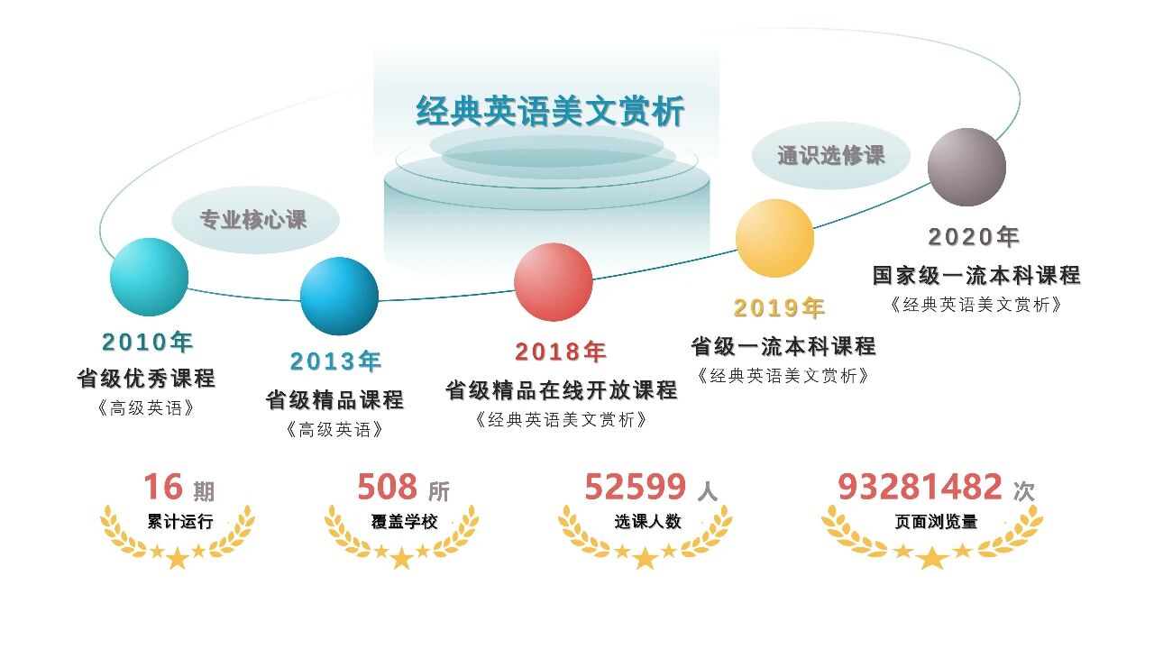 《经典英语美文赏析》课程起源于外国语学院开设的《高级英语》,随着学校通识教育改革的推进,课程由专业核心课拓展为面向全校本科生开放的通识选修课,育人功能和覆盖面得到显著提升。课程立足英美文学经典,既注重英语语言能力的培养,又强调跨文化理解、审美鉴赏和价值引领,帮助学生拓展国际视野、提升人文素养。对农科学子而言,文学不仅是语言的艺术,更是思想的沃土和价值的桥梁,在提升语言能力的同时,也为未来走向世界、讲好中国故事奠定坚实基础。在十余年的持续建设中,课程成果丰硕。2010年获批吉林省省级优秀课程,2013年入选省级精品课程,2018年认定为省级精品在线开放课程,2019年成为吉林省一流本科课程。2020年,课程以线上课程形式成功入选国家级一流本科课程。当前,团队正积极推进智慧课程建设,已完成课程内容重构与资源更新,结合人工智能与大数据技术,探索数智化教学新模式。